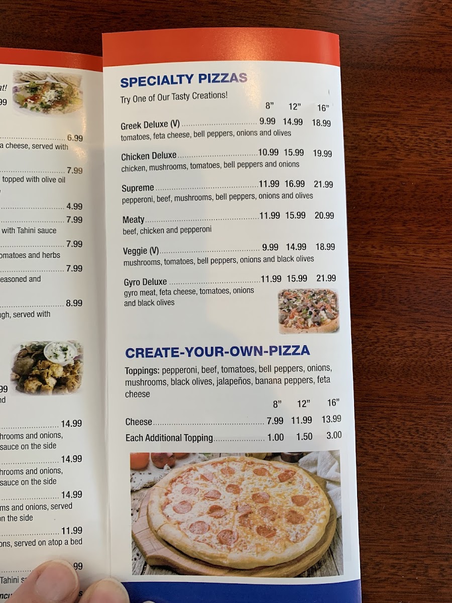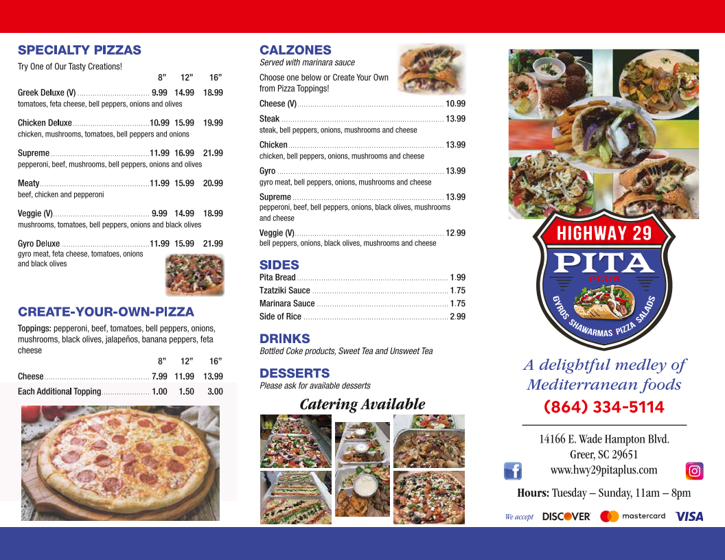 Hwy 29 Pita Plus offers a diverse and flavorful menu that caters to a variety of tastes, with options that will satisfy both meat lovers and vegetarians. The Specialty Pizzas stand out with unique combinations, including the Greek Deluxe (V), Chicken Deluxe, SupremeMeaty, and the fresh, veggie-packed Veggie (V). For those who prefer to customize their meal, the Create-Your-Own-Pizza section provides a choice of sizes, from a Small Cheese Pizza, Medium Cheese Pizza, to the larger Extra Large Cheese Pizza.