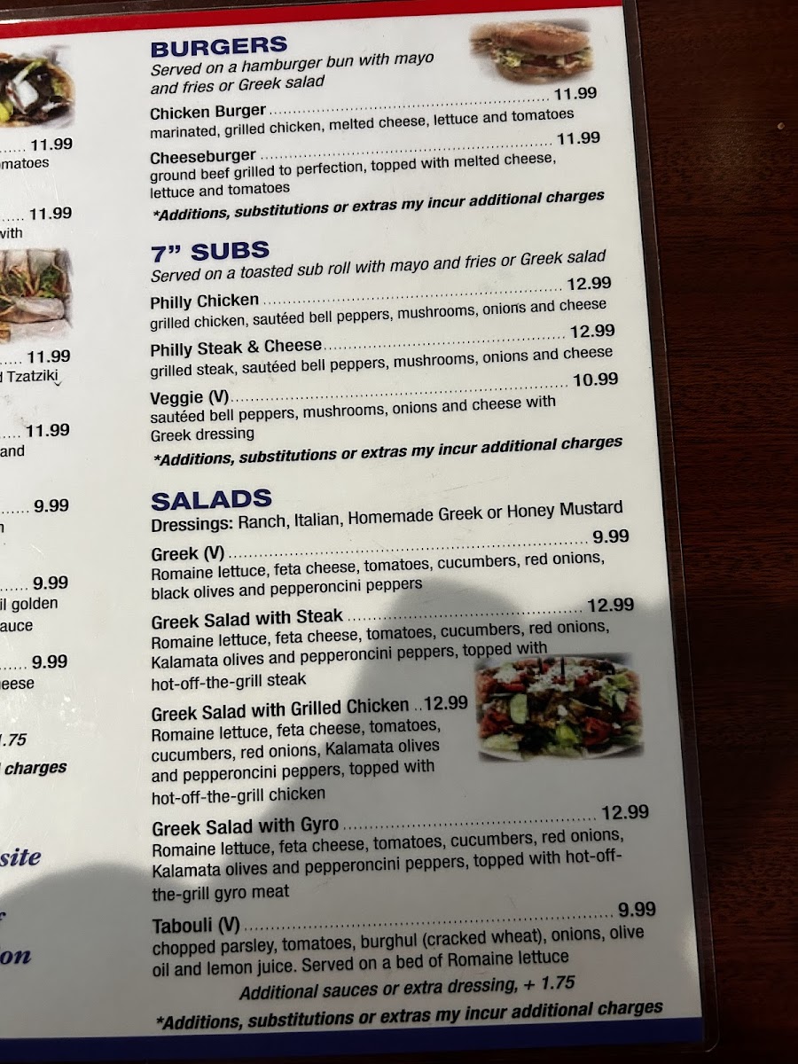 For those who enjoy subs, the 7" Subs menu features the hearty Philly Chicken, Philly Steak & Cheese, and the vegetarian-friendly Veggie (V) sub. When it comes to fresh, vibrant salads, the Greek Salad options with Steak, Grilled Chicken, or Gyro are perfect for a light yet satisfying meal. There's also the refreshing Tabouli (V) for a healthy and tasty option.