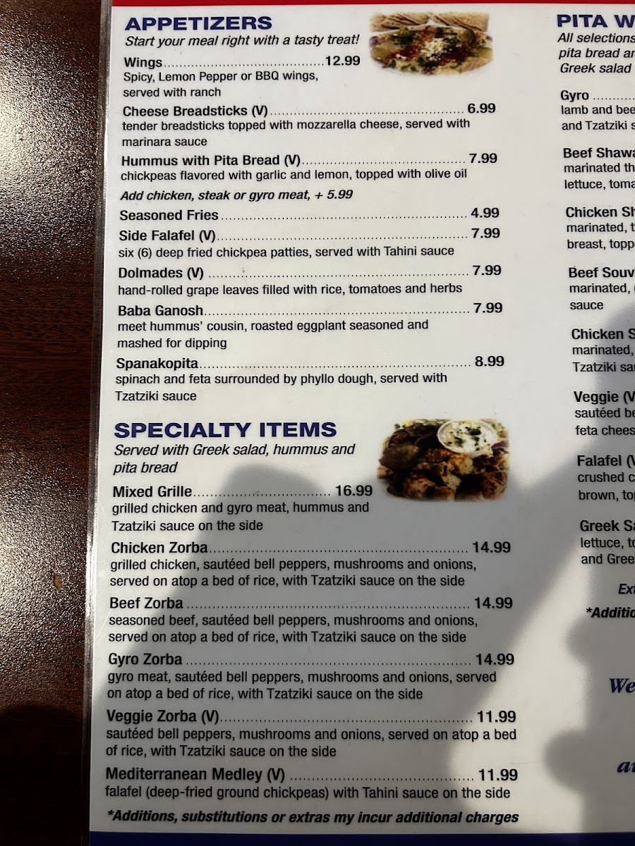 Lastly, the Specialty Items section includes standout dishes like the Mixed Grille, flavorful Chicken Zorba, Beef Zorba, and the veggie-packed Veggie Zorba (V), all perfect for those looking to try something new and exciting.