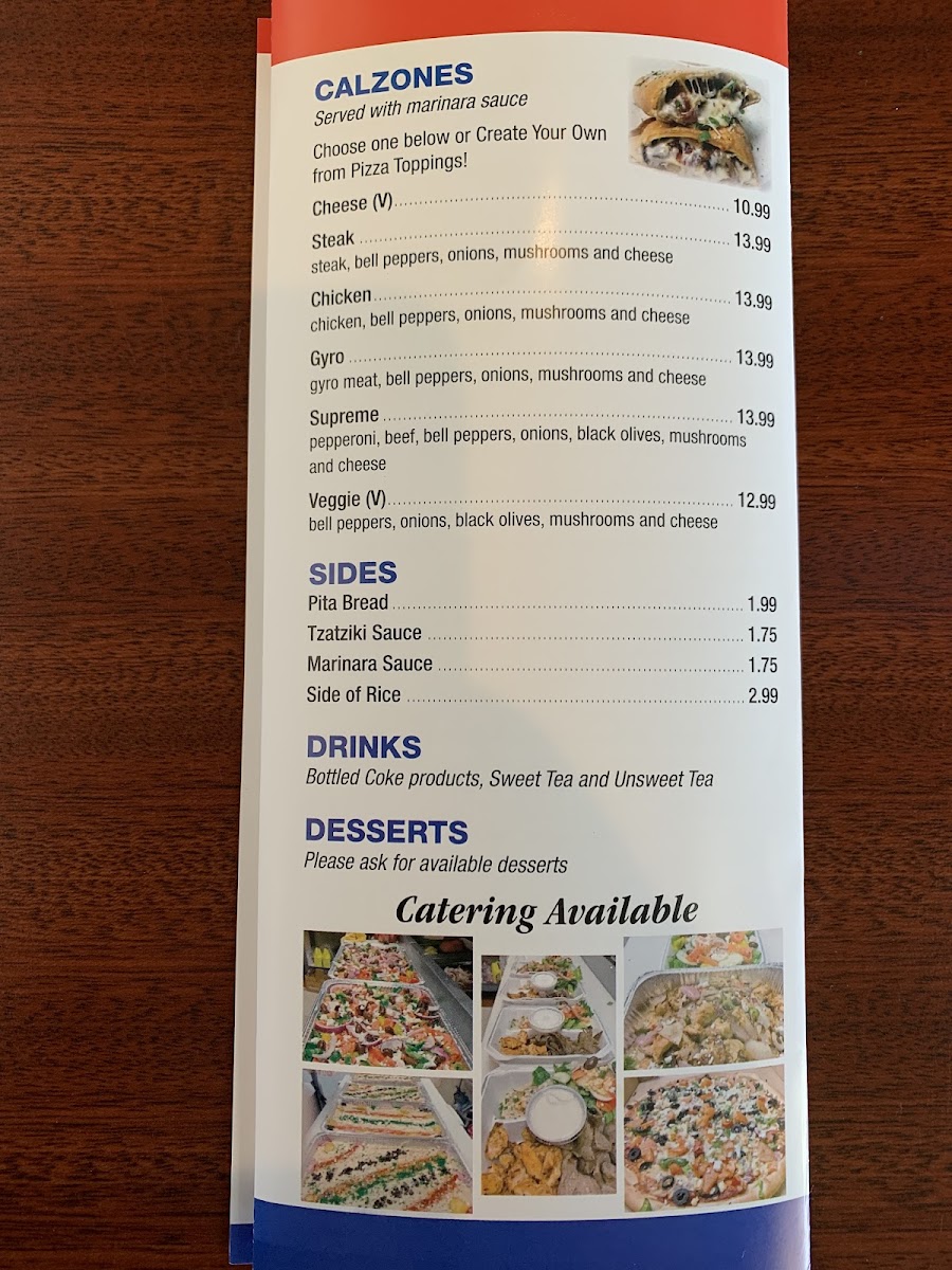 For a warm and comforting meal, the Calzones are a great option, with choices like the classic Cheese (V), savory Steak, or hearty ChickenGyro and Supreme varieties. The sides are simple but delicious, featuring essentials such as Pita Bread, Tzatziki Sauce, and Marinara Sauce. For those looking for something a bit more filling, there's also a Side of Rice to accompany your dish.
